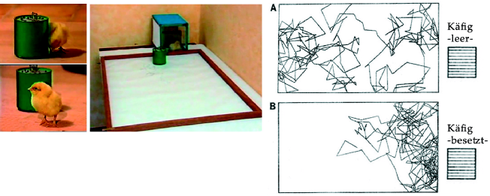 Bild B zeigt den Lauf des Roboters, wenn das Küken im Käfig sitzt. Der Roboter bewegt sich verstärkt in der Ecke mit dem Küken. Fazit: Das Gefühl des Kükens beeinflusst den zufälligen Lauf des Roboters.